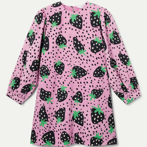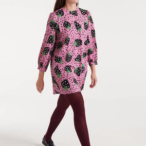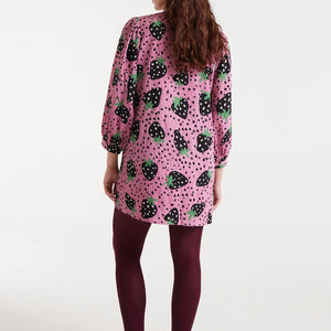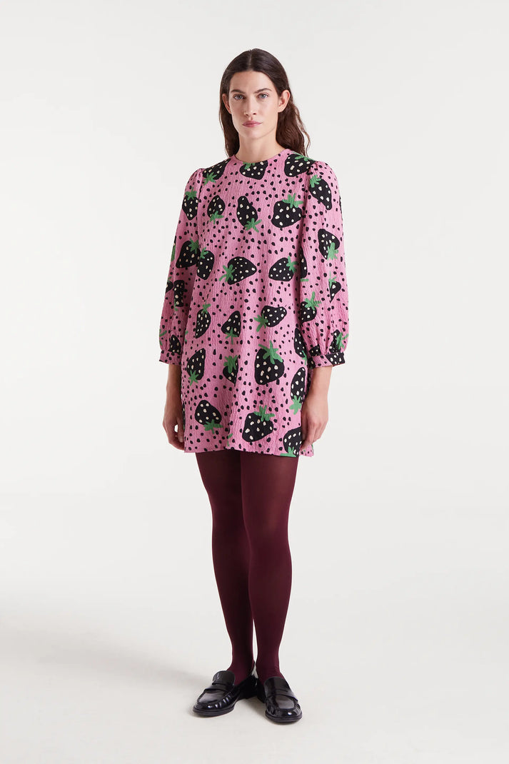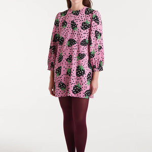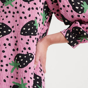 Abito corto in tessuto leggero e stropicciato con stampa Morango Big.