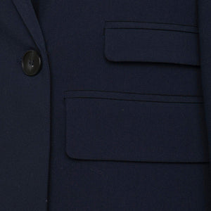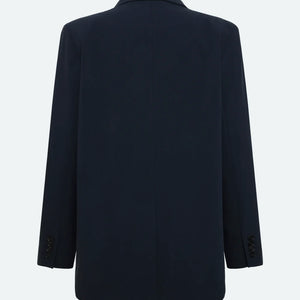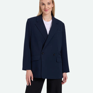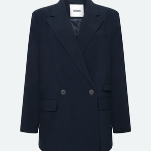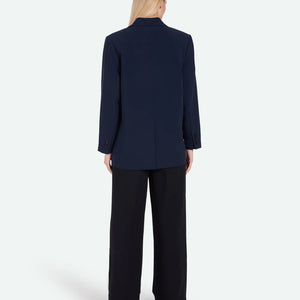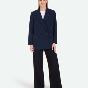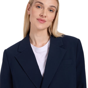 Il blazer ha una vestibilità oversize e presenta spalline e un colletto a revers minimalista.