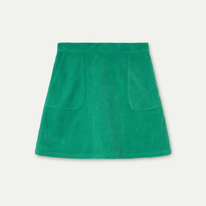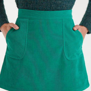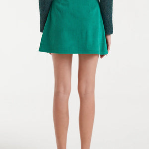 Gonna corta in velluto a coste verde.