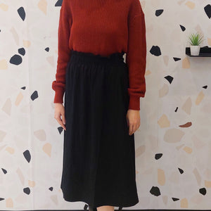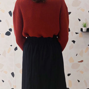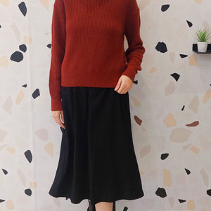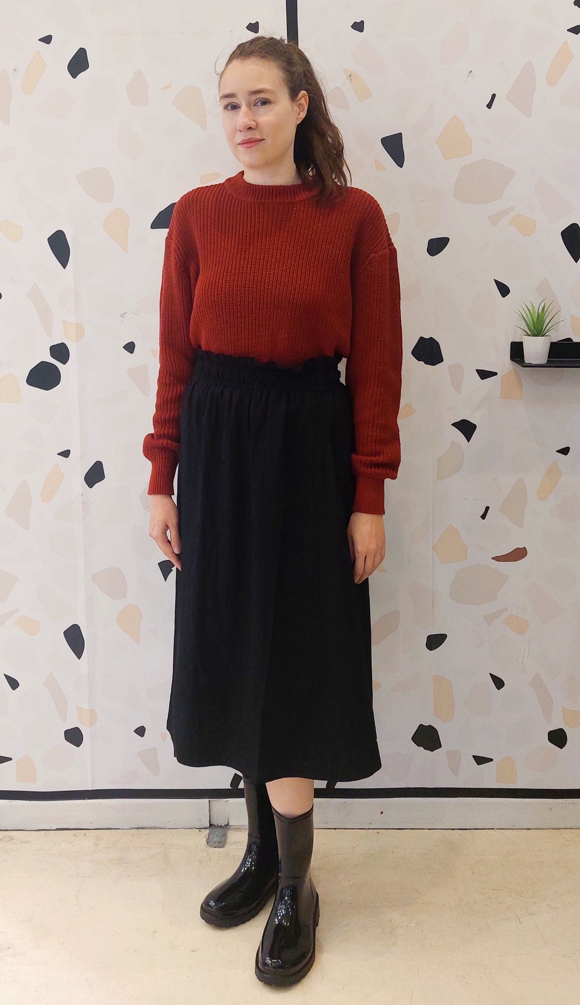 Vestibilità leggermente ampia, struttura a coste all over, girocollo e spalla scesa.