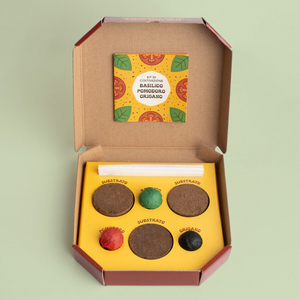 Il kit include: 3 sacchetti da coltivazione biodegradabili, 3 pastiglie di substrato, 1 bomba di semi di basilico, 1 bomba di semi di pomodoro, 1 bomba di semi di origano e istruzioni per l’uso.
