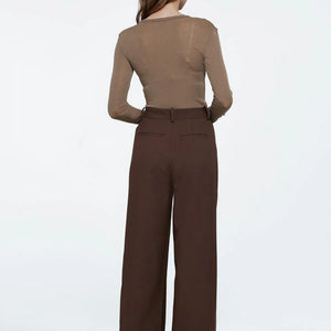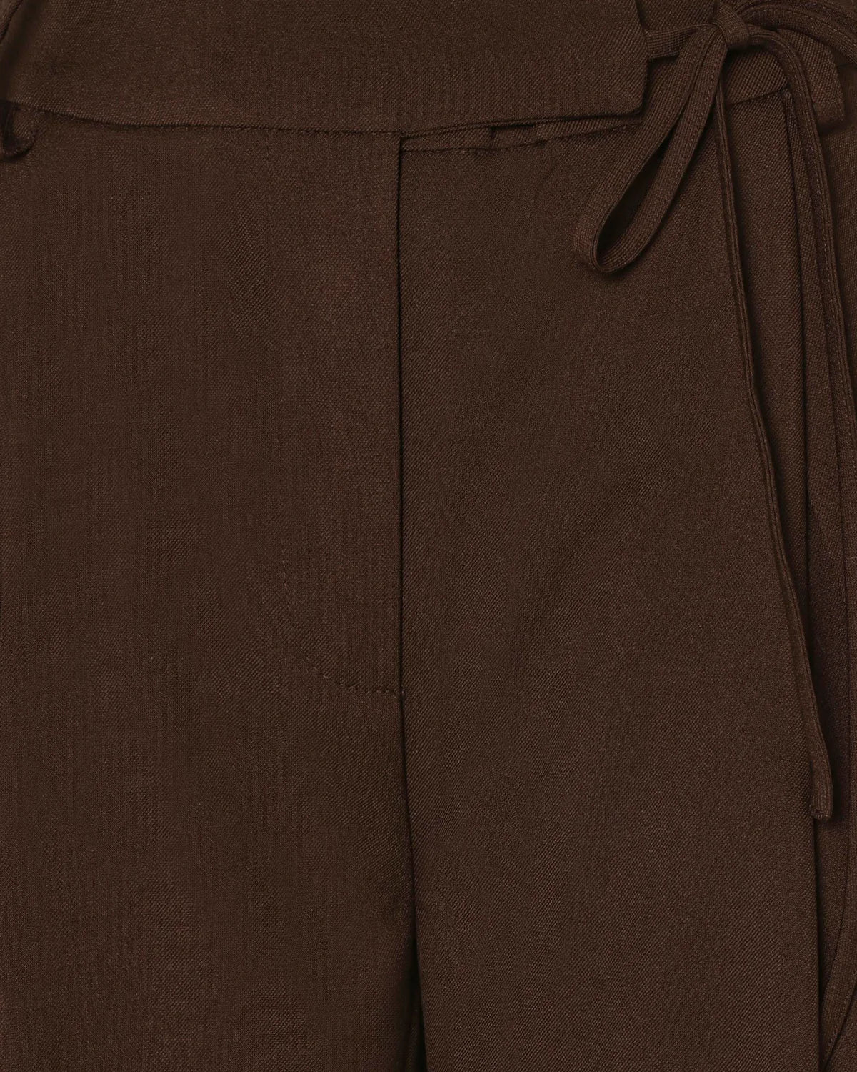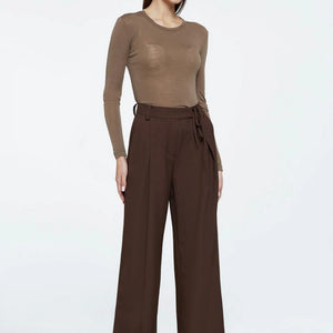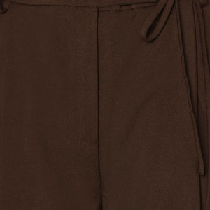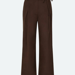 Gunli è un paio di pantaloni da abito ampi realizzati in 93% poliestere riciclato, 5% viscosa e 2% elastan. I pantaloni hanno vita alta, vestibilità ampia e presentano pinces aperte sul davanti, dettagli con nastro da annodare, due tasche e due tasche a filetto sul retro. La modella è alta 180 cm e indossa una taglia 36.