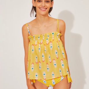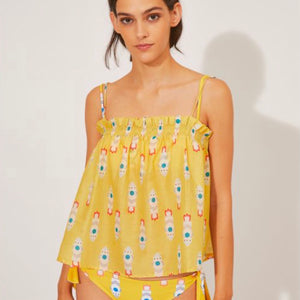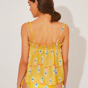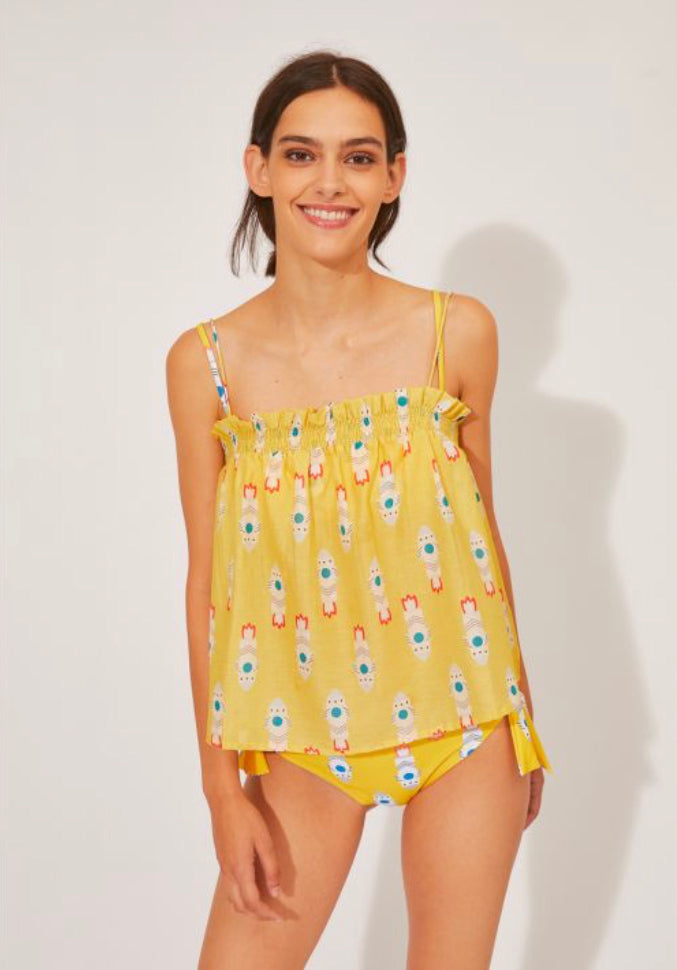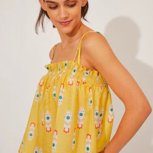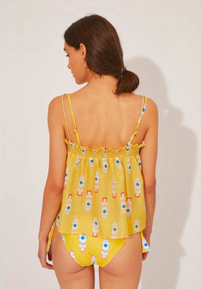 Top svasato con stampa di razzi. Scollo dritto con dettaglio di balza ed elastico. Spalline sottili doppie. La modella indossa la taglia S.