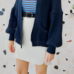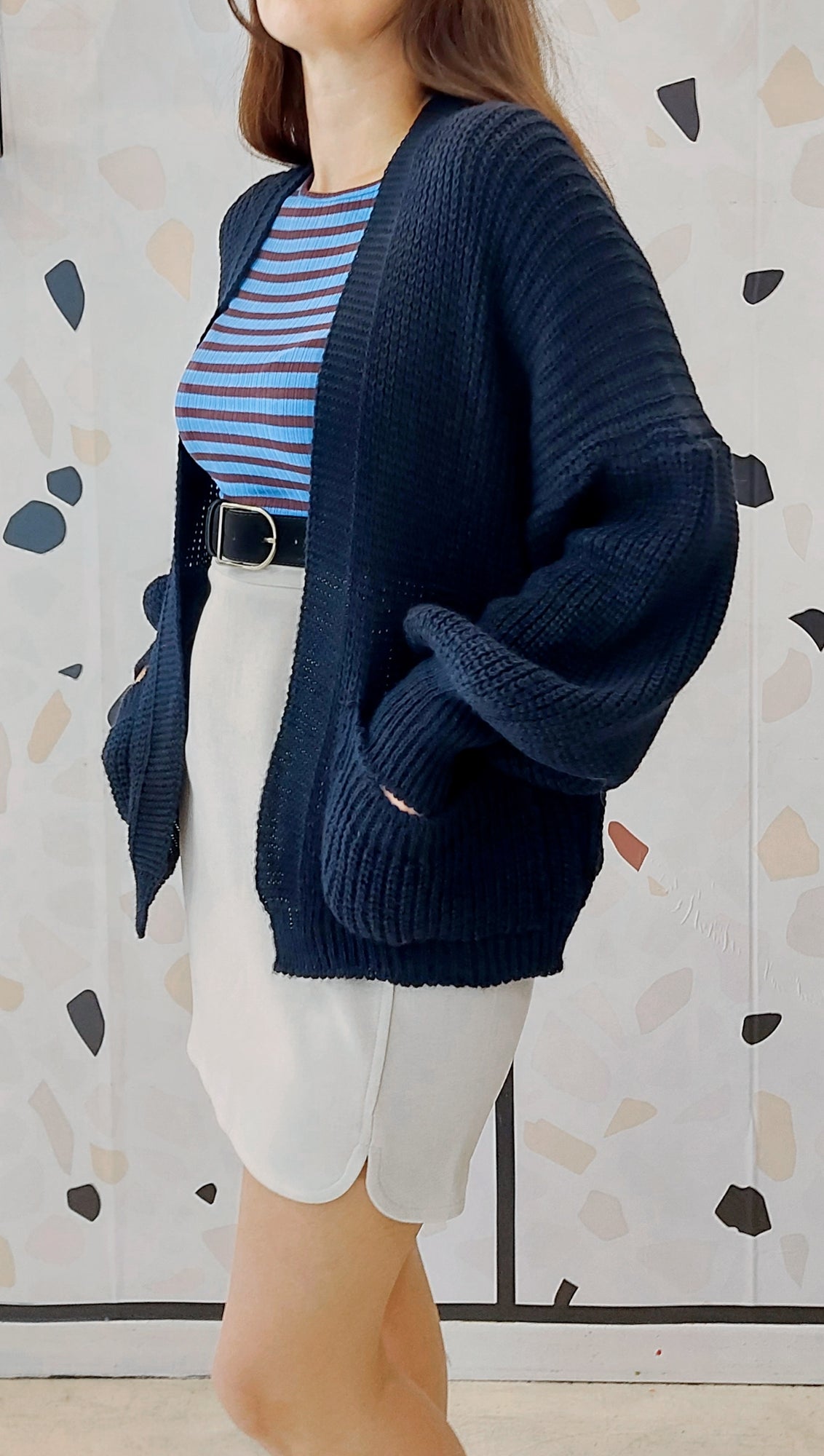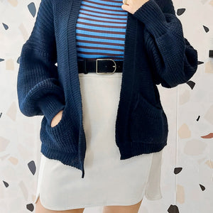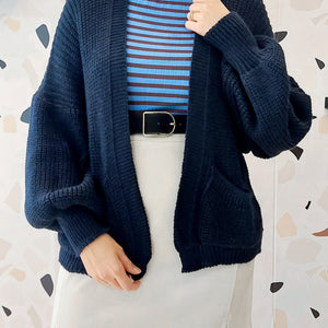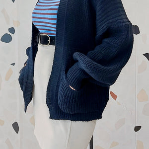 Cardigan blu a maglia larga.