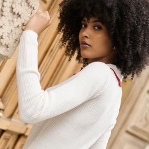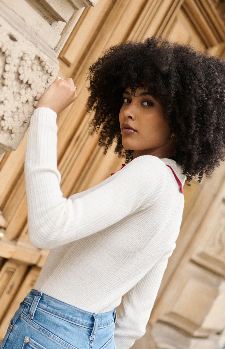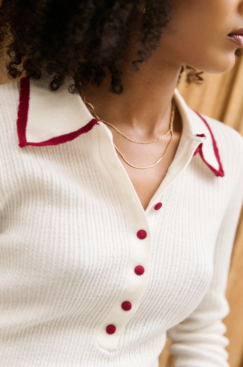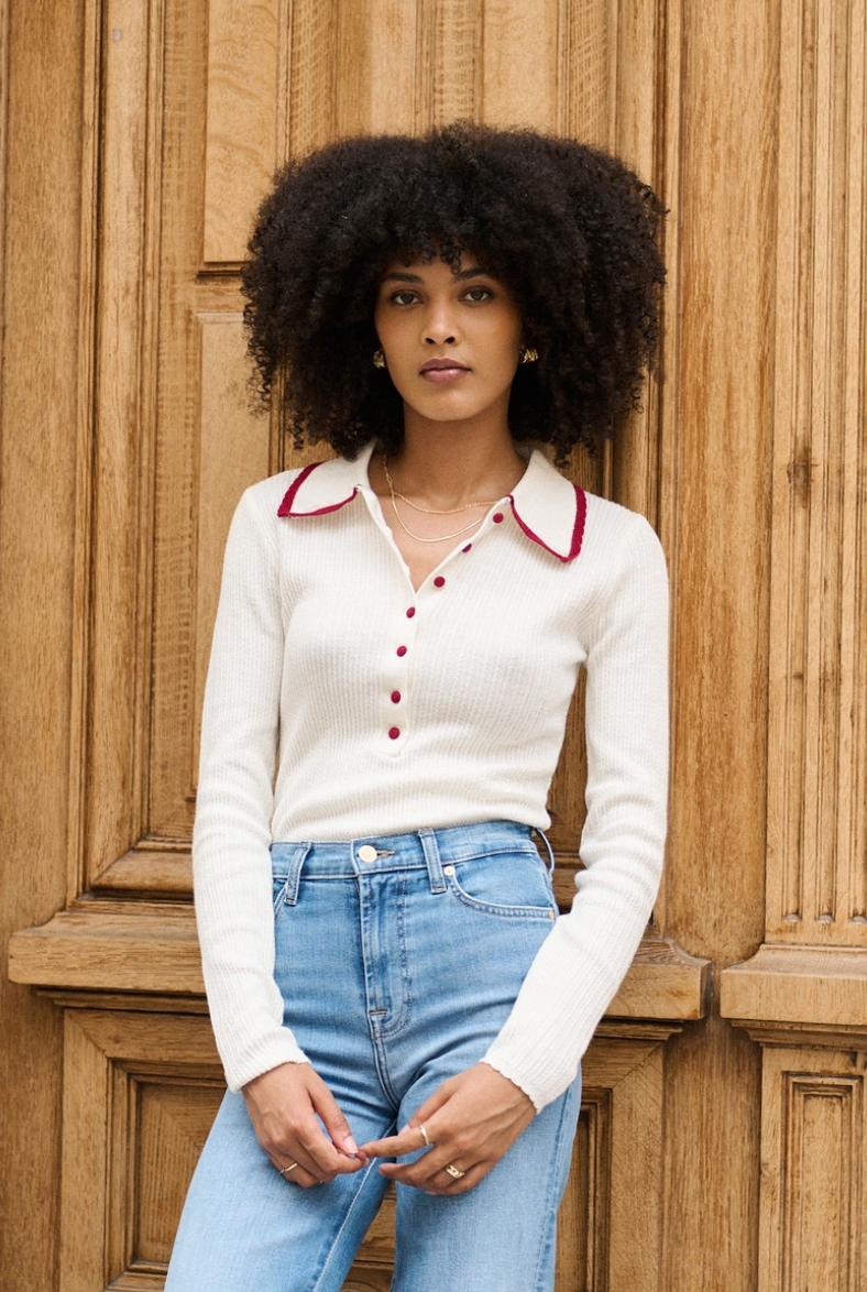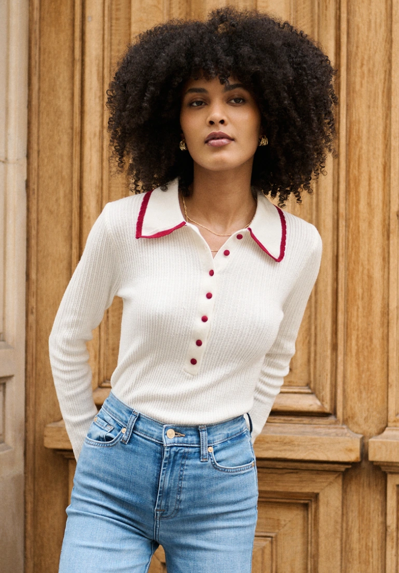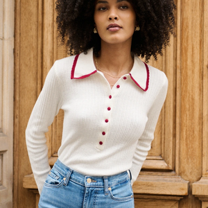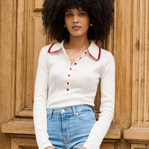 Polo a maniche lunghe color avorio con bordino a contrasto rosso.