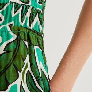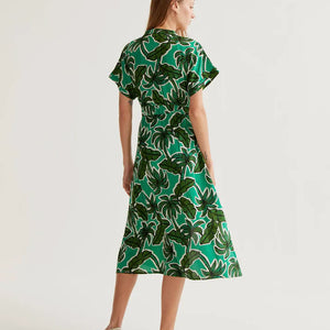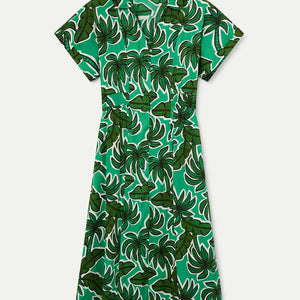 Abito midi con stampa di palme. Collo a revers e scollo a V. Maniche corte e chiusura frontale con bottoni verdi. Dettaglio elastico in vita. Tasche laterali. La modella è alta 177 cm e indossa una taglia S.