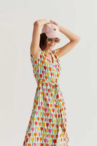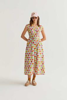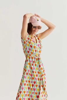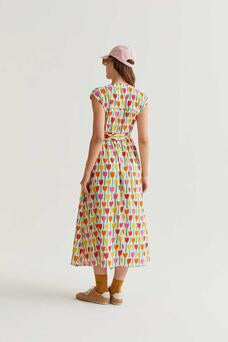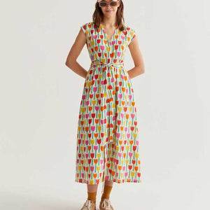Abito lungo in 100% cotone con stampa a tulipani. Scollo a V e senza maniche. Chiusura frontale con bottoni nascosti e cintura in vita. Completamente foderato. La modella è alta 177 cm e indossa una taglia S.