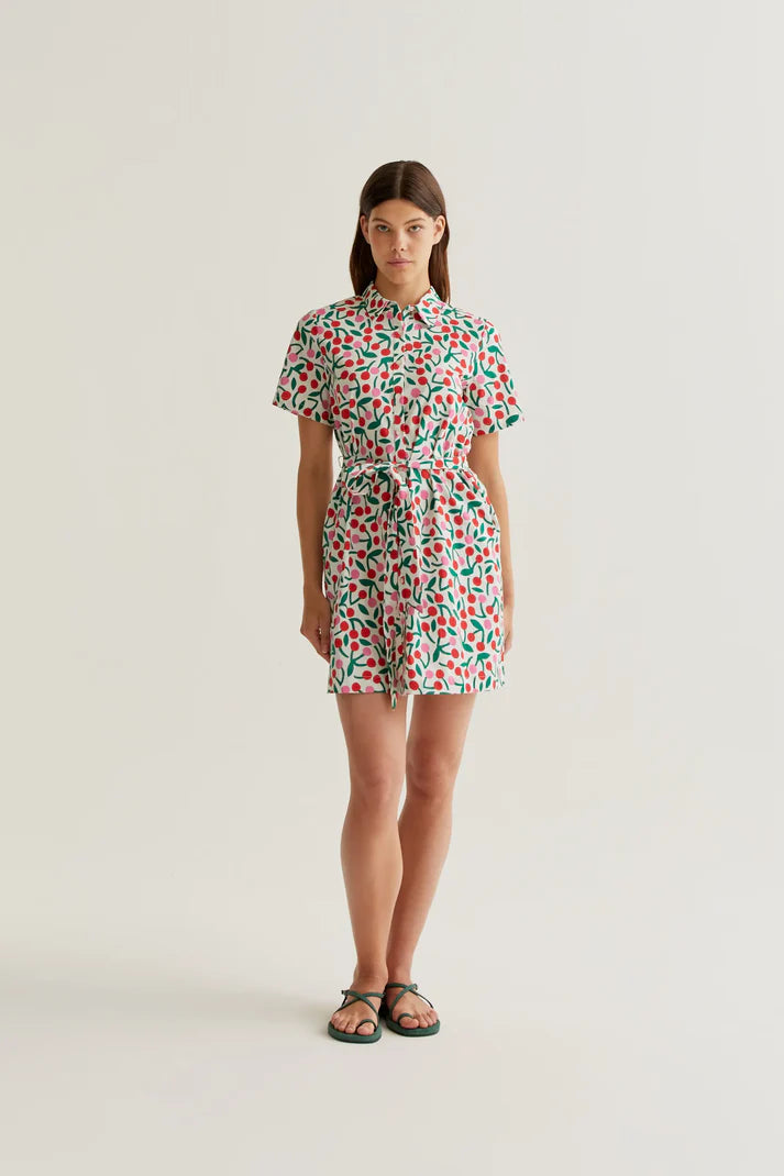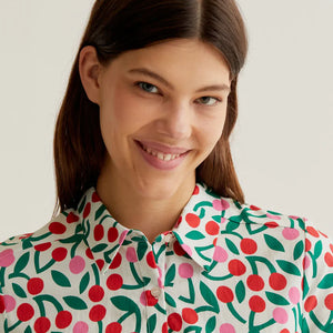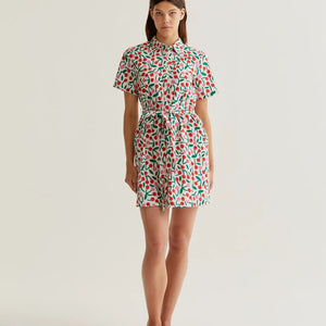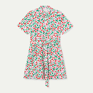 Abito corto in leggero tessuto crêpe con stampa tochi. Collo a revers e maniche corte. Chiusura frontale con bottoni bianchi. Cintura in vita. La modella è alta 177 cm e indossa una taglia S.