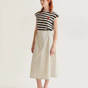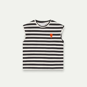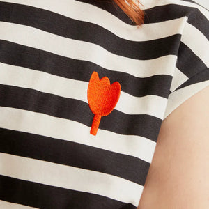 T-shirt 100% cotone con stampa a righe bianche e nere. Scollo rotondo e maniche corte. Dettaglio tulipano ricamato. La modella è alta 175 cm e indossa la taglia S.