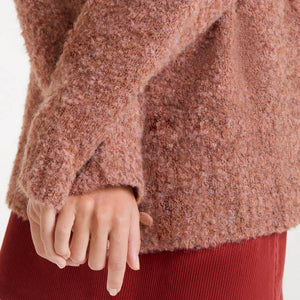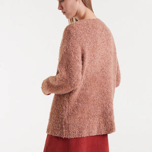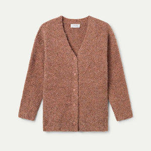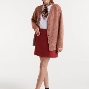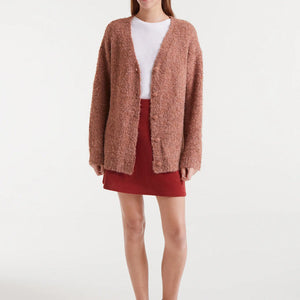 Giacca lunga color cammello testurizzata con scollo a V e maniche lunghe con spalle leggermente scese.