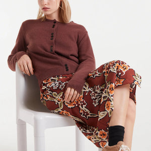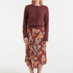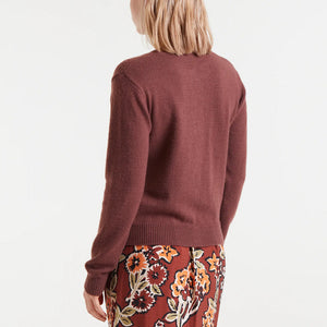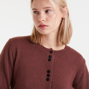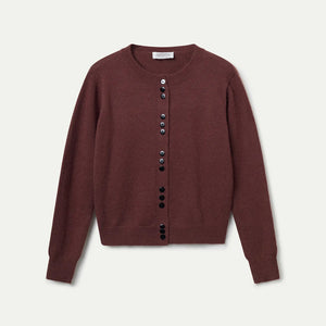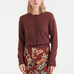 Cardigan in maglia marrone con scollo rotondo e maniche lunghe con spalle leggermente scese.