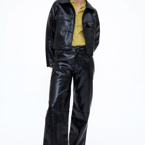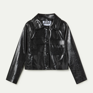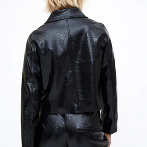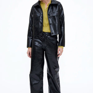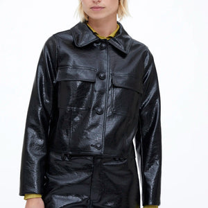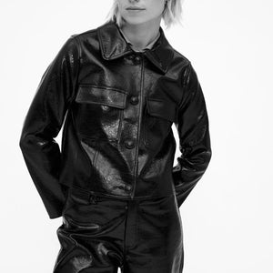 Giacca in similpelle nera con collo a revers e maniche lunghe. Chiusura frontale con bottoni. Cuciture a vista e tasche anteriori con patta.