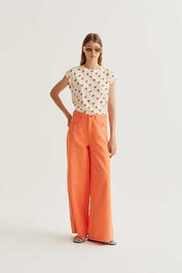 T-shirt 100% cotone con stampa arancione. Scollo rotondo e maniche corte. La modella è alta 177 cm e indossa la taglia S.