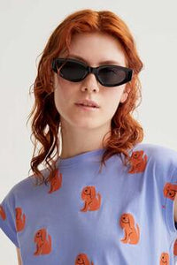 T-shirt 100% cotone con stampa di un cane blu. Scollo rotondo e maniche corte. La modella è alta 175 cm e indossa una taglia S.